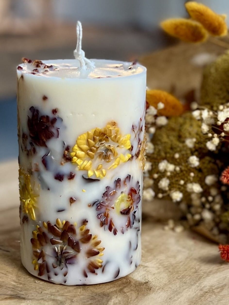 Bougie pilier avec Fleurs incrustées